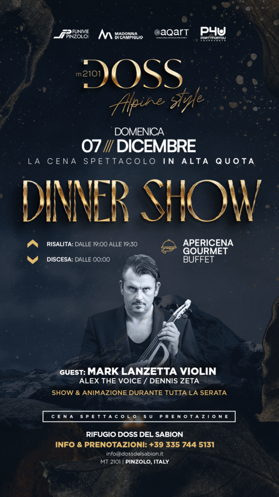 Preparati a vivere una serata unica al Rifugio Doss Alpine Style 2010m: una cena spettacolo in alta quota, con musica, show e un’atmosfera esclusiva a 2.101 metri.